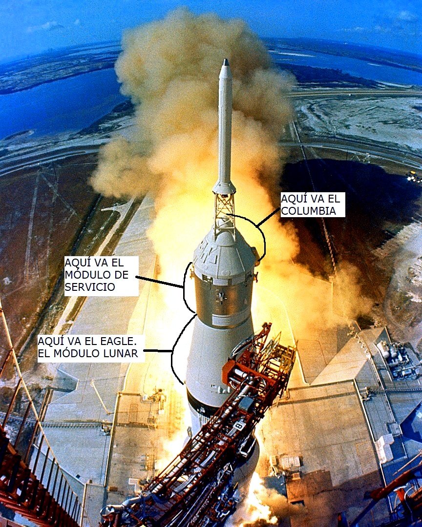 La nave Apollo 11 que despegó de cabo Kennedy en julio de 1969 (cabo Cañaberal se llamó cabo Kennedy durante un tiempo) estaba formada por el cohete Saturno V, el módulo Lunar, el módulo de servicio y el módulo de mando o mejor dicho módulo de comando nº 107. Oficialmente despegaba la misión AS-506.